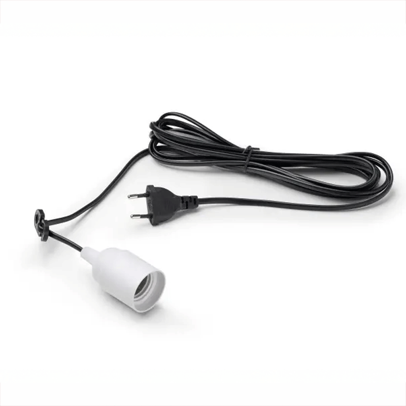 - Variante 40/75 mit E27 Sockel: Hochwertiges stabiles Befestigungsset: E27 Lampenfassung (weiß) inklusive Befestigungsöse für Stahlseil 400cm Stromkabel (2×0.75mm²) mit Eurostecker anschlussfertig verkabelt (schwarz). 400cm Stahlseil (2mm) mit Höhenverstellung und Sicherheitskarabiner zur Abhängung von der Decke.