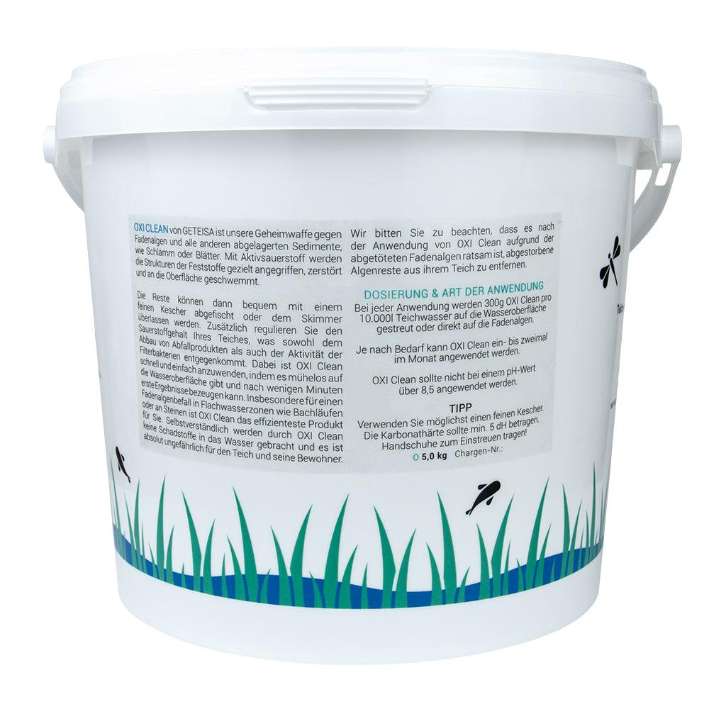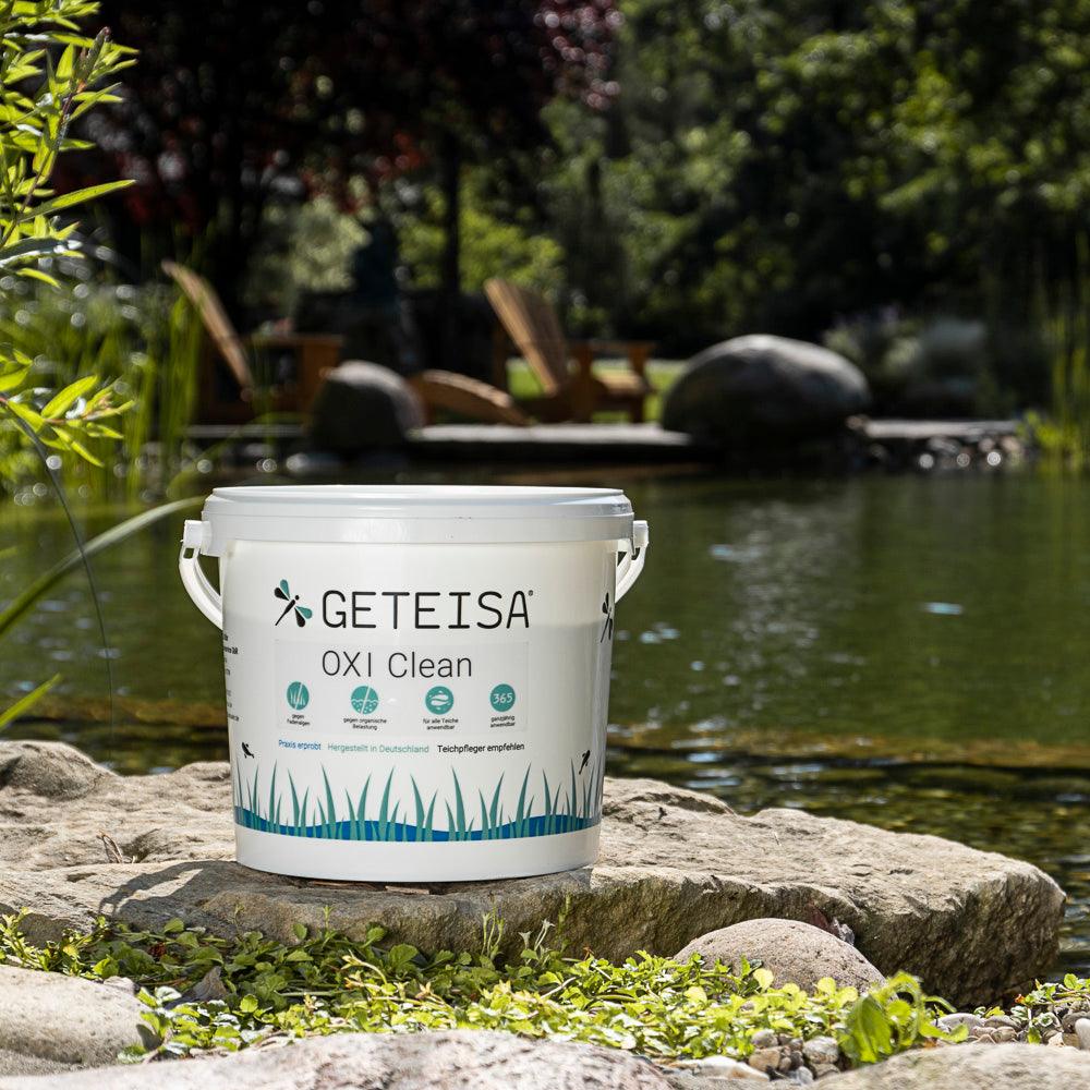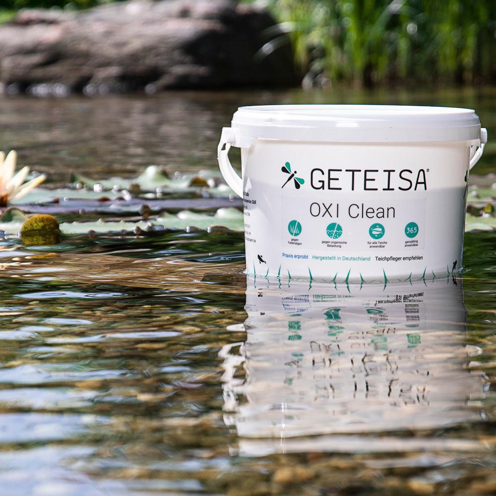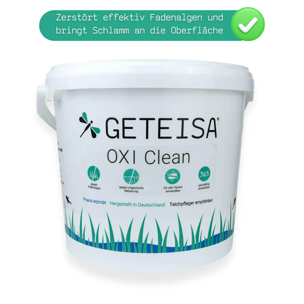 OXI Clean von GETEISA ist unsere Geheimwaffe gegen Fadenalgen und alle anderen abgelagerten Sedimente, wie Schlamm oder Blätter. Mit Sauerstoff werden die Strukturen der Feststoffe gezielt angegriffen, zerstört und an die Oberfläche geschwemmt. Die Reste können dann bequem mit einem feinen Kescher abgefischt oder dem Skimmer überlassen werden. Zusätzlich regulieren Sie den Sauerstoffgehalt Ihres Teiches, was sowohl dem Abbau von Abfallprodukten als auch der Aktivität der Filterbakterien entgegenkommt.