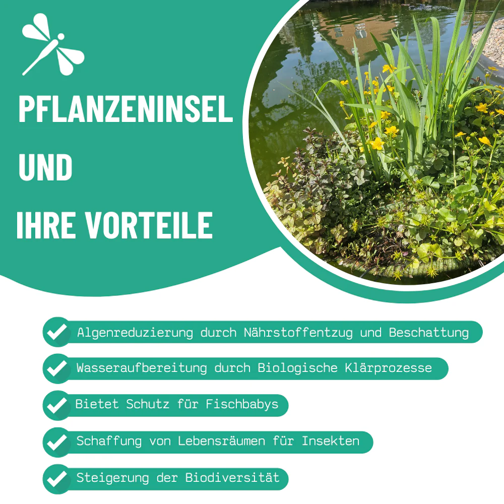 Pflanzinseln sind begrünte, sich frei bewegende Inseln auf der Teich- oder Gewässeroberfläche. Je nach Größe werden sie mit unterschiedlichen Wasserpflanzen begrünt. Sie schwimmen an der Oberfläche und bewegen sich nur durch die Bewegung im Teich oder durch den Wind. Alternativ können die Pflanzinseln auch mit einem Anker fest positioniert werd. Im Teich sind sie ein echter Hingucker. Die GETEISA Pflanzinseln gibt es in 2 verschiedenen Formen. Diese sind rund und rechteckig. Sie bieten Jungfischen speziell Schutz vor Fressfeinden. Im Sommer bieten Sie den Fischen Schutz vor zuviel Sonneneinstrahlung und die frei zugänglichen Wurzeln dienen als Nahrung. Ein weiterer großer Vorteil dieser freischwimmenden Wurzeln der Bepflanzung ist, dass diese kontinuierlich Nährstoffe aus dem Teich entnehmen und so einem Algenwachstum vorbeugen. Pflanzeninseln spenden Schatten und schützen somit das Gewässer vor einer übermäßigen Erhitzung. Die GETEISA Pflanzinseln unterstützen außerdem die Biodiversität und die Artenvielfalt. Mit ihrem Bewuchs dienen sie als Heimat und Nahrungsquelle für Bienen, Hummeln und anderen Insekten. Mit Pflanzeninsel von GETEISA leisten Sie einen Beitrag zur Artenerhaltung und Artenvielfalt im eigenen Garten.
