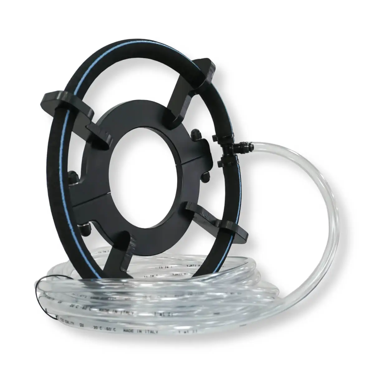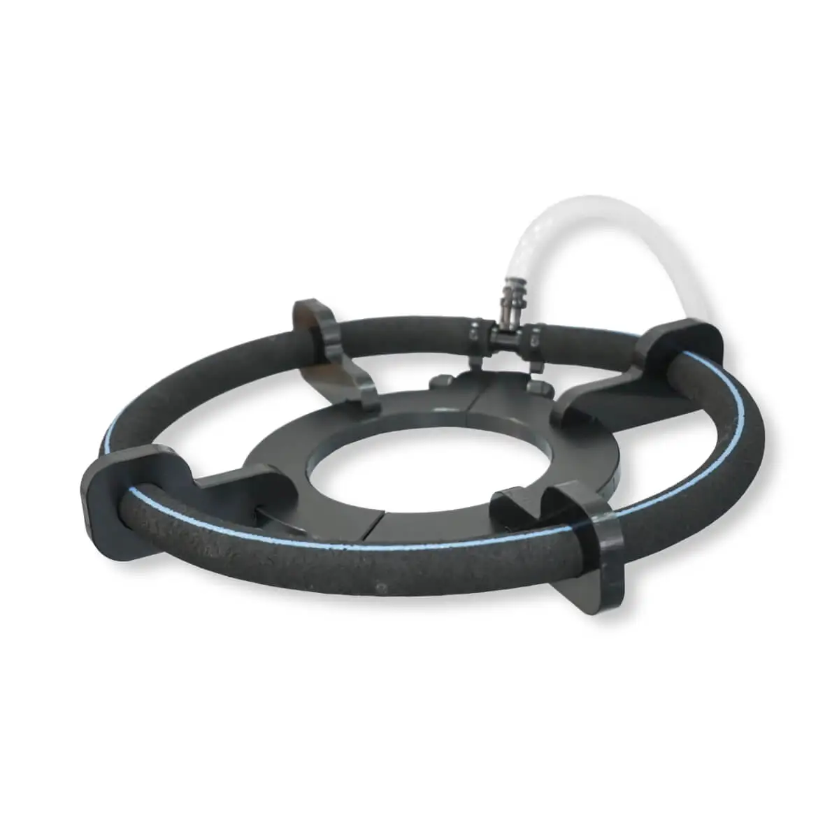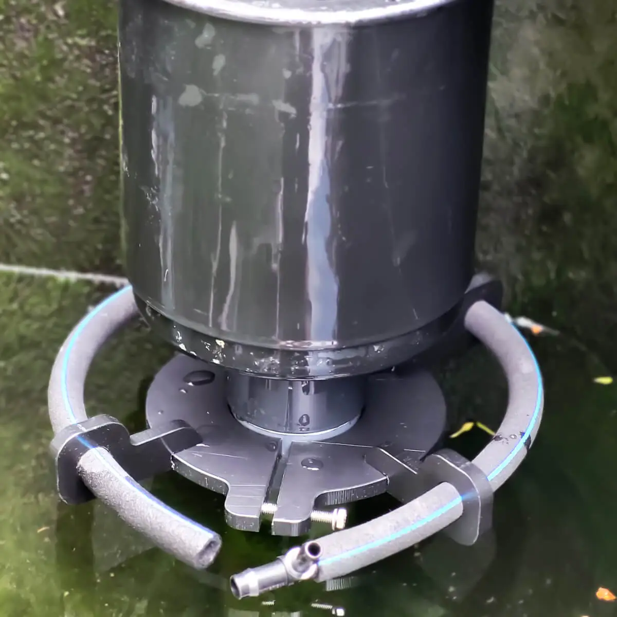 Das System bestehend aus einer Halterung mit Belüfterschlauch. Unter dem Skimmer montiert, erzeugt die aufsteigende Luft im Wasser eine Strömung, die das Futter vom Skimmer fernhält.