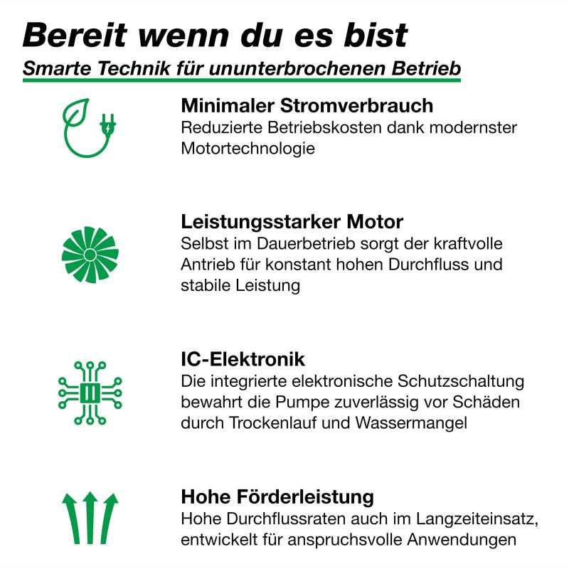 • Intelligente Schutzabschaltung bei Trockenlauf oder Blockaden