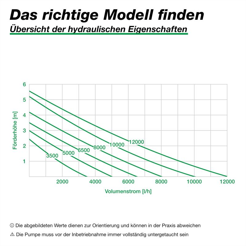 Das vorstehende Leistungsdiagramm veranschaulicht die Fördermengen der sechs verfügbaren Modelle der Wagner GREEN SUPER ECO+ Serie in Abhängigkeit zur Förderhöhe. Es dient als praktische Entscheidungshilfe, um das passende Modell für Ihren individuellen Teichbedarf auszuwählen. Bitte beachten Sie, dass es sich um Richtwerte handelt, die je nach Installation, Verschmutzungsgrad und Gegendruck in der Praxis leicht abweichen können.