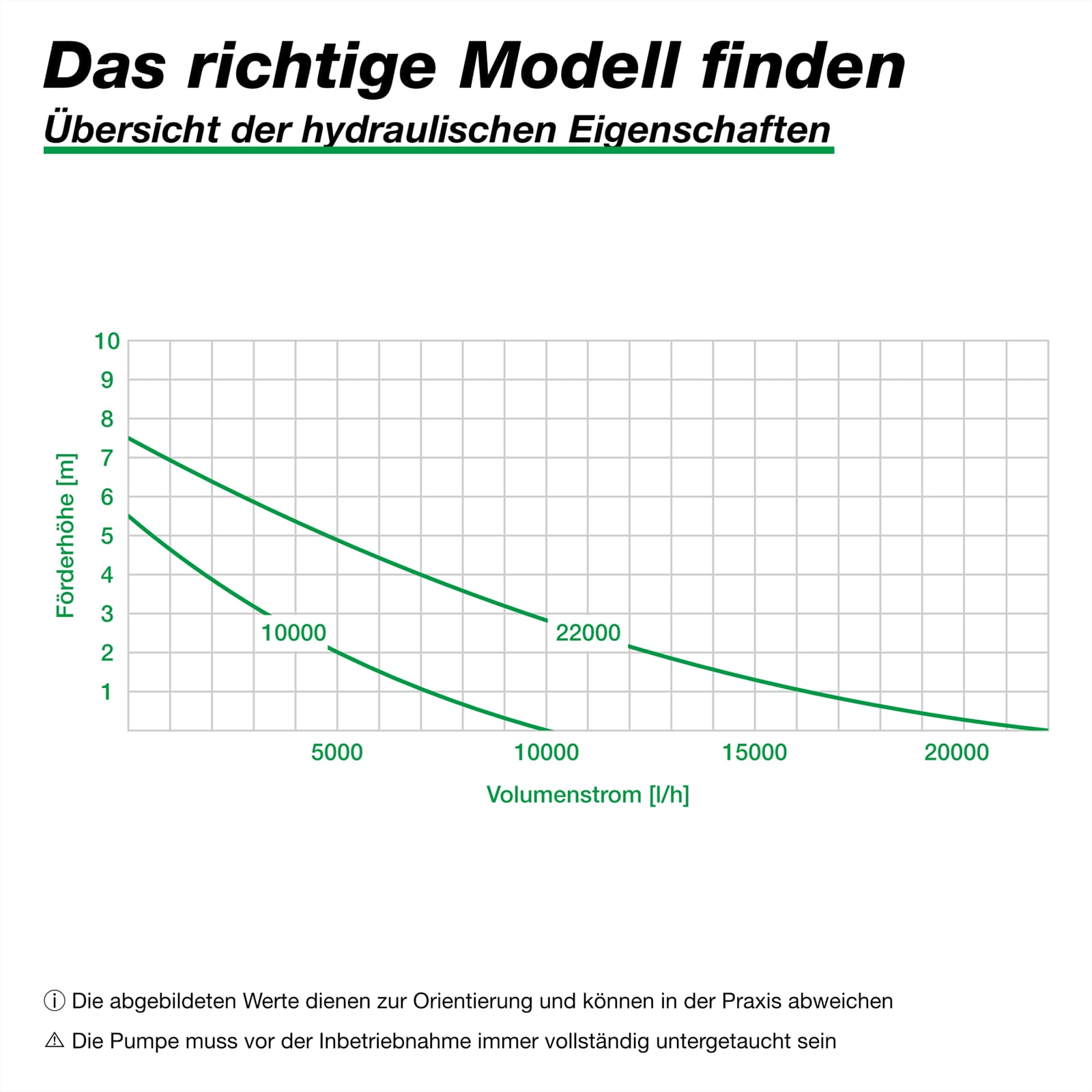 Das obenstehende Leistungsdiagramm zeigt die Fördermenge der Pumpen in Abhängigkeit zur jeweiligen Förderhöhe. Die Grafik dient als hilfreiche Orientierung, um die Pumpe optimal an die Anforderungen Ihres Teichsystems anzupassen. Bitte beachten Sie, dass es sich um Richtwerte handelt. Je nach individueller Installation, Verschmutzungsgrad und Gegendruck kann die tatsächliche Förderleistung variieren.